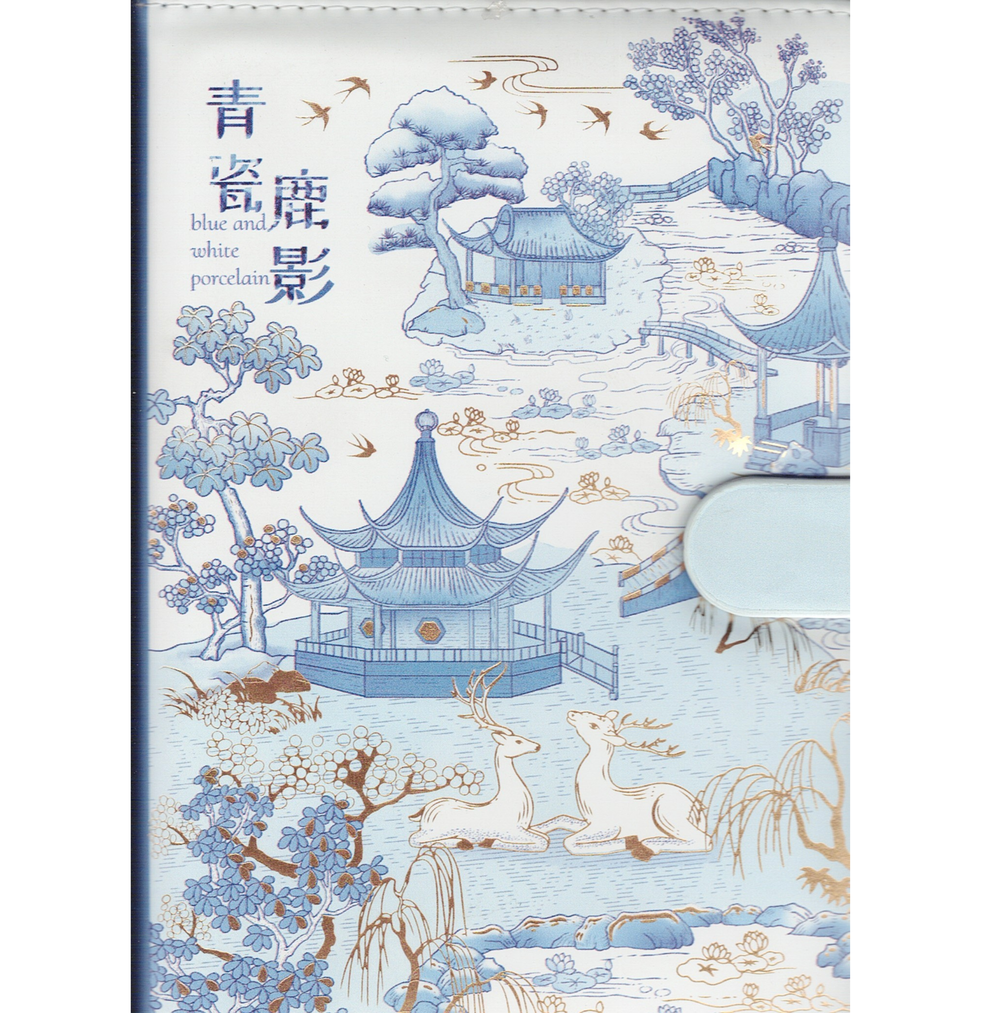 "Blue & White" es una libreta que evoca la belleza de la porcelana tradicional china. Su cubierta presenta un diseño detallado con ilustraciones en tonos azules sobre fondo blanco, inspiradas en los motivos clásicos de la porcelana china. Los toques dorados y el cierre con broche realzan su elegancia.
